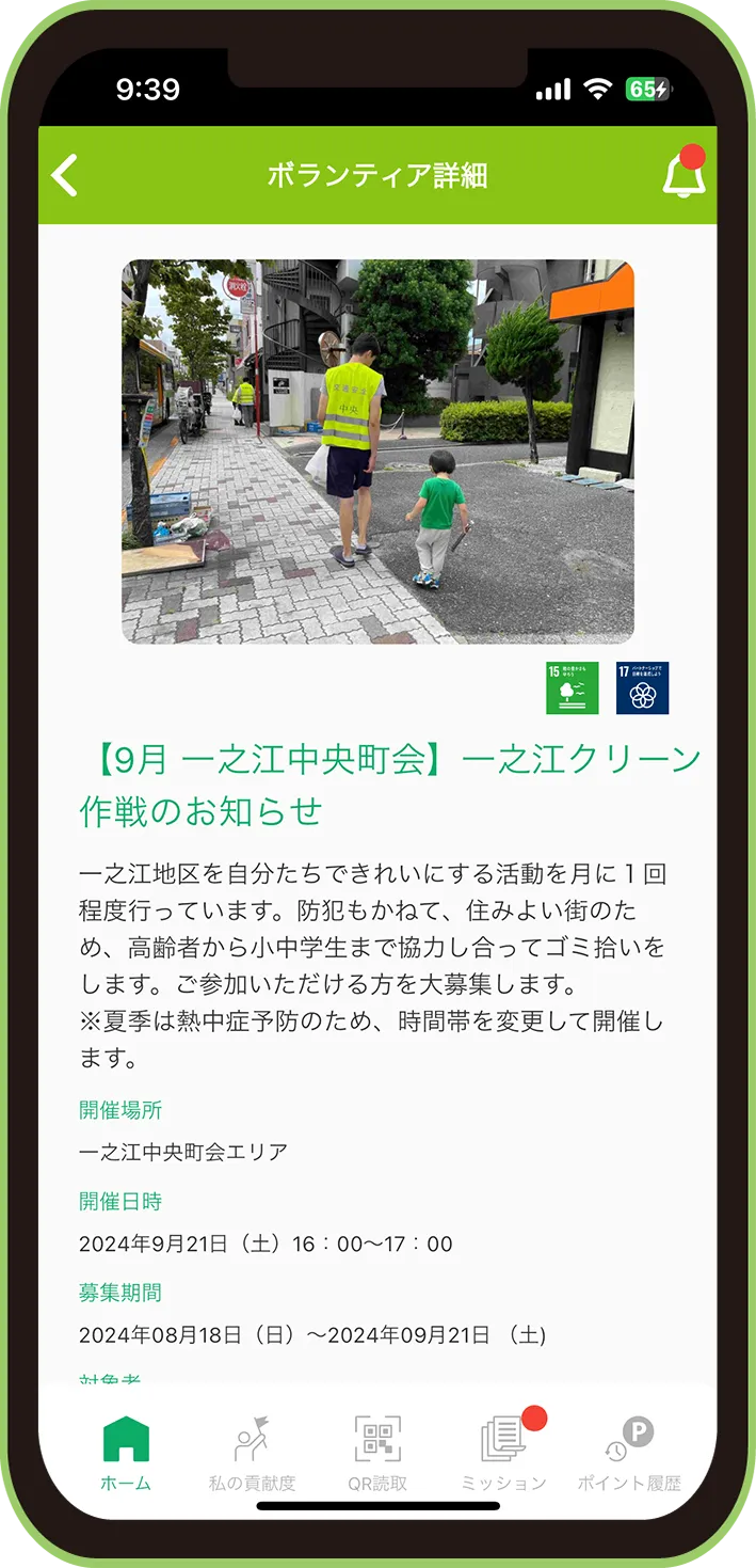 アプリを使ってボランティアの参加など、SDGsにつながる行動をすることでポイントが貯まり、地域のつながるスポットで使えます。ポイントの有効期限は獲得から6カ月間です。